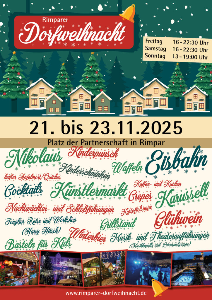 Zum fünften Mal findet die Rimparer Dorfweihnacht nun schon malerisch am Platz der Partnerschaft im Zentrum der Marktgemeinde statt. Zahlreiche Vereine und Institutionen haben sich zusammengefunden, um den Besuchern bei Glühwein, Kinderpunsch, Waffeln, Mandeln, Flammkuchen, Bratwürsten, Steaks, Pommes und vielem mehr einen wunderschönen Start in die Vorweihnachtszeit zu bieten.